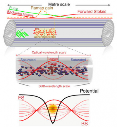In a cooperation effort between the Max Born Institute and Xlim Institute in Limoges, researchers show that sub-wavelength localisation and line narrowing is possible in a very simple arrangement due to self-organisation of Raman gas (molecular hydrogen) in a hollow photonic crystal fibre. Due to Raman scattering, the continuous-wave pump light transforms into the so-called Stokes sideband, which travels back and forth in the fibre due to reflections from fibre ends and forms a stationary interference pattern—a standing wave with interchanging regions of high and low field (see Figure). In the high-field regions, the Raman transition is saturated and is not active, and the molecules have high potential energy since they are partially in the excited state. In the low-field region, the molecules are Raman-active, and they have low potential energy since they are close to the ground state. These low-field regions form an array of roughly 40,000 narrow, strong traps, which contain localised Raman-active molecules. The size of these traps is around 100 nm, which is much smaller than the light wavelength of 1130 nm. Therefore, the emitted Stokes sidebands have a very narrow spectral width of only 15 kHz—this is 10,000 times narrower than the Doppler-broadened sidebands for the same conditions. Details of this work have been published in Nature Communications.
